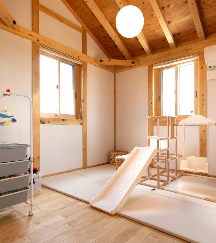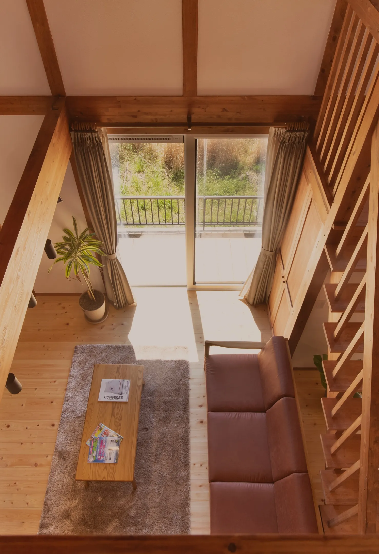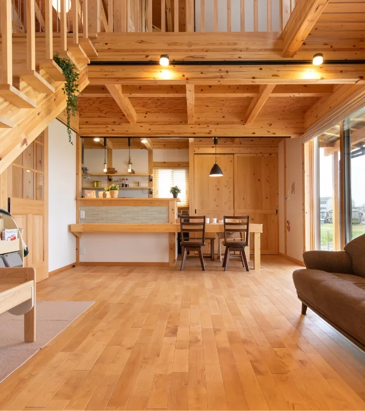 国産のひのき無垢材をたっぷり使った「木の家」。ひのきの香りに包まれた家の中は、まるで森の中にいるみたいな五感でリラックスできる癒し空間です。 -