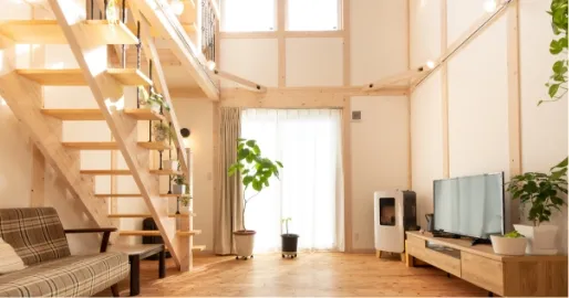 サイエンスホームでは、標準設計で「吹抜け」や「勾配天井(屋根の形状に合わせて天井に傾斜をつけた天井)」を採用しているので、LDKや居室でも視線が広がり開放感が楽しめます。